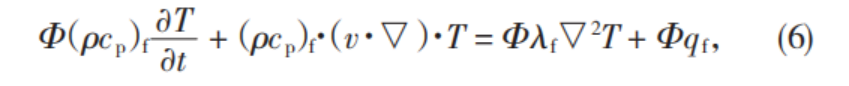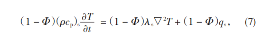 兩種能量增加帶來的溫升是基于多孔介質材料內的固體部分。假設固體部分的密度表示為ρs,其比熱容表示為cs。假定研究對象熱物性參數,如比熱容、導熱系數等,不受到時間和空間改變帶來的影響,多孔介質本身始終為各項同性的,并且多孔介質材料內部細小孔隙的容積均被流體填充,則有: