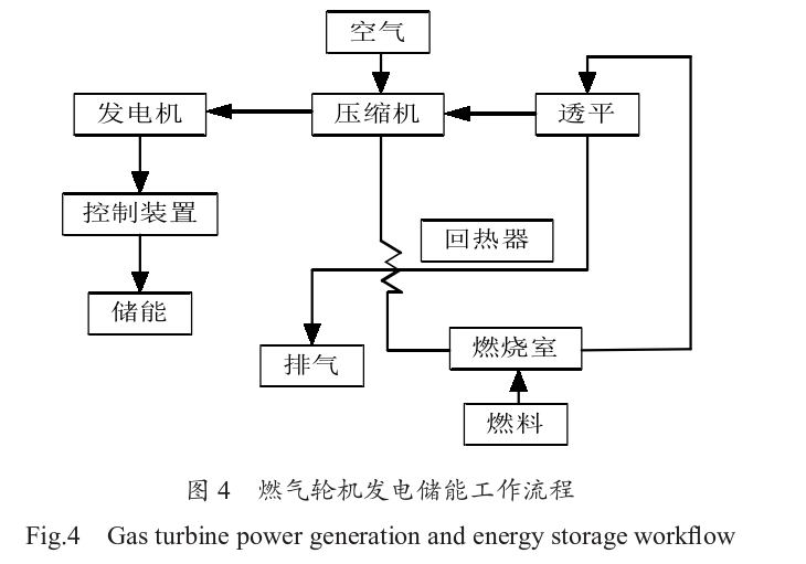 燃氣輪機發(fā)電儲能是通過燃料供給系統(tǒng)將天然氣輸送到燃燒室。天然氣在燃燒室內(nèi)與空氣混合燃燒,產(chǎn)生高溫高壓的燃氣。這些高溫高壓的燃氣迅速膨脹,并流經(jīng)透平葉片, 推動透平旋轉(zhuǎn)。透平葉片通過軸連接到發(fā)電機,透平的旋轉(zhuǎn)帶動發(fā)電機的轉(zhuǎn)子旋轉(zhuǎn),從而在定子中產(chǎn)生電流,完成電能的轉(zhuǎn)換。最終將電能儲存到儲能系統(tǒng)中,以便在電力需求高峰期或電網(wǎng)出現(xiàn)故障時進行釋放和使用。如圖4所示。在燃氣輪機發(fā)電儲能過程中,儲能系統(tǒng)可以幫助平衡燃氣輪機發(fā)電的輸出波動。燃氣輪機的啟動和停止時間較長,且燃料燃燒效率和發(fā)電效率容易受環(huán)境溫度和負荷變化的影響。通過儲能系統(tǒng)的調(diào)節(jié),可以在短時間內(nèi)補償輸出功率的波動,確保電網(wǎng)的穩(wěn)定運行。在負荷較低時,燃氣輪機的效率較低, 部分燃料會被浪費。儲能系統(tǒng)可以在這種情況下存儲多余的電能,并在電力需求高峰期釋放,減少燃氣輪機的啟動和停止次數(shù),從而提高整體的能源利用效率。