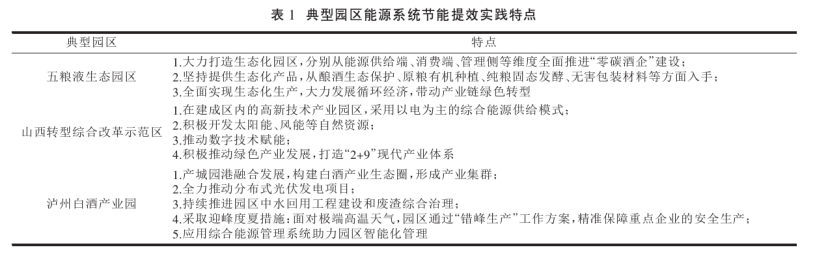 園區在推動我國實體經濟發展和城鎮化發展中發揮了關鍵作用,是支撐制造強國戰略的主戰場。有研究表明,園區二氧化碳排放量約占全國總排放量的31%[4],園區資源能源消耗最集中的地方。現階段,為了節約能源,保護環境,我國各級園區都在持續推動綠色低碳發展。田金平等研究指出我國工業園區節能提效實踐創新主要體現在以下5個方面: ①聚焦重點領域,全過程系統性推進節能工作。②集中式能源基礎設施升級改造,多樣化開發利用余熱、 余壓和能量多級利用。③積極利用可再生能源,推進能源結構轉型升級。④積極開展智慧能源探索,實現能源全過程精細化管理。⑤建立健全能源管理體系。表1為典型園區能源系統節能提效實踐特點。