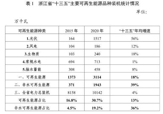 表 1 浙江省"十三五"主要可再生能源品種裝機統(tǒng)計情況