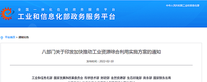 地大熱能地熱+多能互補網訊:2月10日,工業和信息化部、國家發展和改革委員會、科學技術部、財政部自然資源部生態環境部、商務部、國家稅務總局等八部門聯合印發了《關于印發加快推動工業資源綜合利用實施方案的通知》(下文簡稱《通知》)。