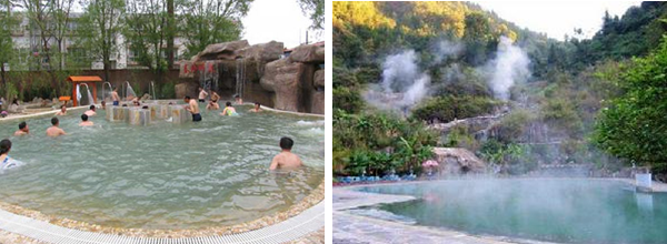 熱水溫泉地處老圖山脈東緣山麓,分布面積為0.42平公里,日最大可采儲量1800~2100噸,中心孔深503米,自流水溫高達當地沸點97℃,是全國水溫最高的溫泉之一。泉水中含有碳酸氯鈉、硫化氫、二氧化硅、氡、氟、碘、硼、銅、銀、鉀、鈦、鈄、鎂、、鈣等卜幾種化學物質及微量元素,對神經衰弱、高血壓、糖尿病、皮膚病、胃病、布氏桿菌癇、多發性神經炎、增生性脊柱炎、氣管炎等30多種常見疾病有很好的療效和較強的保健作用。